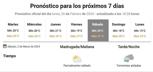 Según el pronóstico extendido del Servicio Meteorológico Nacional se esperan lluvias y tormentas aisladas el sábado en la tarde. La temperatura mínima será de 20 grados y la máxima de 31 grados.