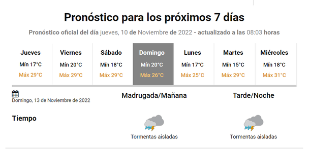 El Servicio Meteorológico Nacional también anuncia tormentas asiladas para el domingo durante todo el día y se mantendrían hasta la mañana del lunes.