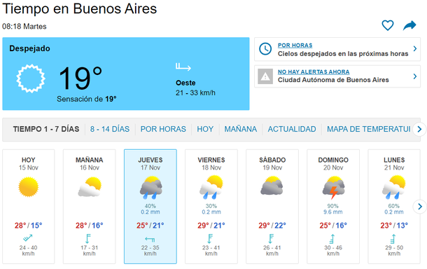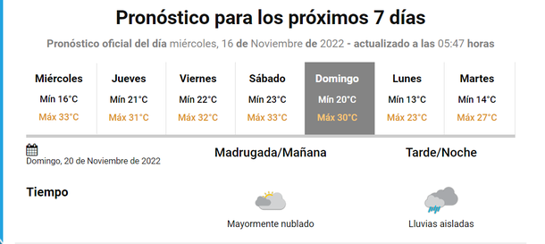 Por ahora hay posibilidades de lluvias para el jueves y viernes 17 y 18 de noviembre, respectivamente, y el mal tiempo se repetiría durante la jornada del domingo que viene.
