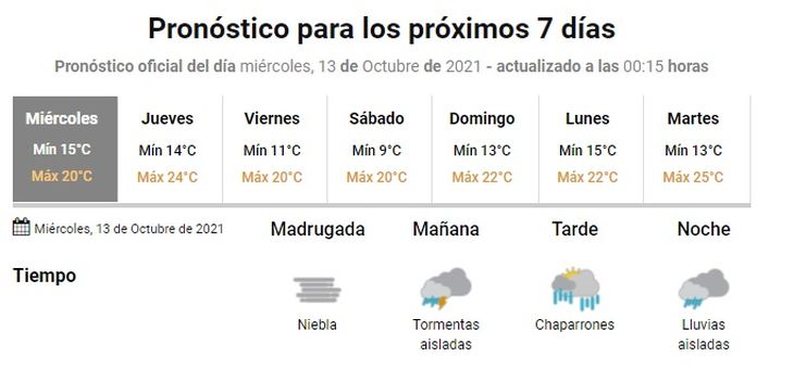 De acuerdo con el organismo, se esperan tormentas aisladas en la mañana, chaparrones por la tarde y lluvias aisladas por la noche. La temperatura rondará entre una mínima de 15 y una máxima de 20 grados.