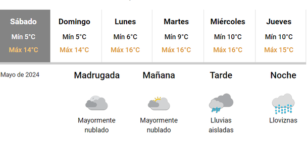 Para hoy se espera un día con marcas térmicas que se ubicarán entre los 5 y 14 grados. La inestabilidad comenzará por la tarde pero las mayores chances de lluvias serán hacia la noche de este sábado.
