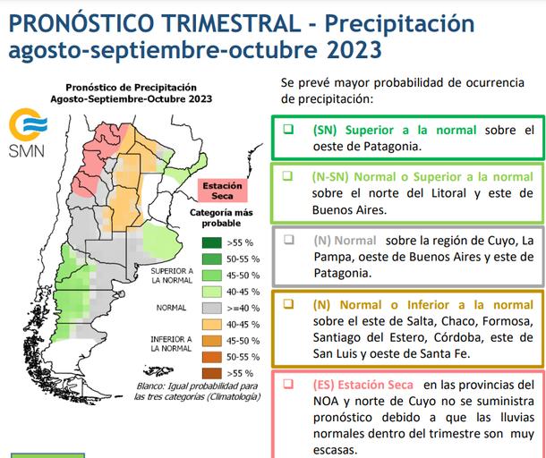 Finalmente, hay Estación Seca en las provincias del NOA y norte de Cuyo no se suministra pronóstico debido a que las lluvias normales dentro del trimestre son muy escasas.
