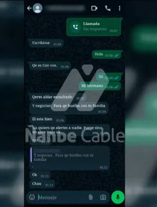 La captura muestra que el hermano llamó al contacto anónimo, quien le pidió que le escriba. "¿Querés hablar, escucharlo y negociar para que vuelva con tu familia?”, le dice y luego asegura: “Él está bien. No quiero que alertes a nadie porque sino no habrá trato ¿ok?”.