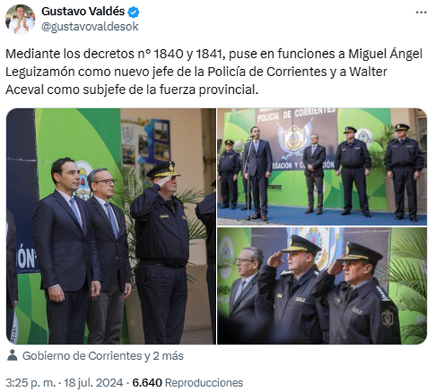 El gobernador Gustavo Valdés presidió este jueves el acto público en el que asumieron los nuevos jefe y vicejefe de la Policía de Corrientes, Miguel Ángel Leguizamón y Walter Aceval, en reemplazo de los desplazados Arnaldo Molina y Jorge Cristaldo, criticados en última instancia por el desarrollo de la búsqueda de Loan Danilo Peña.