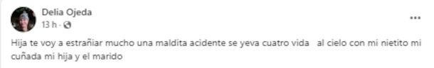La madre de Noelia, Delia Ojeda, publicó un mensaje desgarrador en Facebook, lamentando la pérdida de su hija, su nieto y otros miembros de la familia. “Qué tristeza tengo, hoy se me van cuatro seres queridos”, escribió, acompañando sus palabras con una foto de su hija.