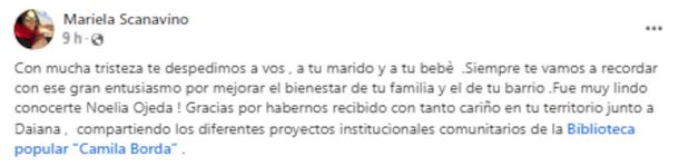 Amigos de Noelia también expresaron su dolor. Mariela Scanavino, una amiga cercana, recordó a Noelia por su entusiasmo y dedicación a la Biblioteca Popular “Camila Borda” en Junín. En sus redes sociales, destacó el compromiso de Noelia con su comunidad y su calidez humana. “Siempre te vamos a recordar con ese gran entusiasmo por mejorar el bienestar de tu familia y el de tu barrio”, escribió.