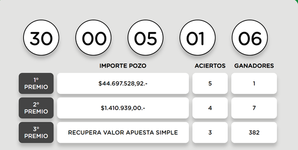 El ganador acertó los siguientes números: 00 01 05 06 30 y así ganó 44.697.528,92 pesos.