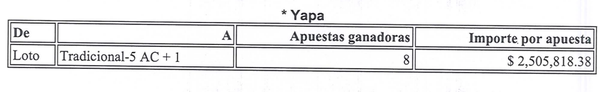 - 5+1 aciertos 8 ganadores: $2.635.818,38 (cada uno)
