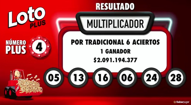 El nuevo millonario acertó en soledad los seis números de la modalidad Tradicional, que fueron el 05 13 16 06 24 28 y gracias a eso, y a que acertó el número plus, que fue el 4, ganó un total de $3.136.791.565 porque sumó a los mil millones iniciales el multiplicador de dos mil millones de pesos.