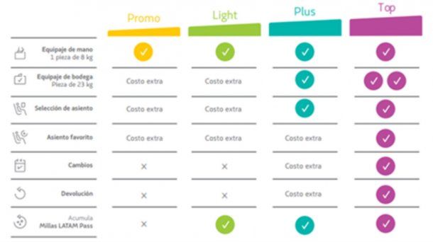 LATAM Airlines anunció este miércoles una serie de modificaciones en su servicio de vuelos por la Argentina. A partir del 1° de septiembre habrá cuatro opciones de tarifas: Promo, Light, Plus y Top, que son adaptaciones de la empresa a la llegada de las low cost.