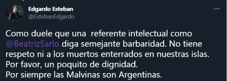 En relación a estos dichos, el Director del Museo Malvinas e Islas del Atlántico Sur, Edgardo Esteban, escribió en su cuenta de Twitter: "Como duele que una referente intelectual como Beatriz Sarlo diga semejante barbaridad. No tiene respeto ni a los muertos enterrados en nuestras islas. Por favor, un poquito de dignidad. Por siempre las Malvinas son Argentinas".