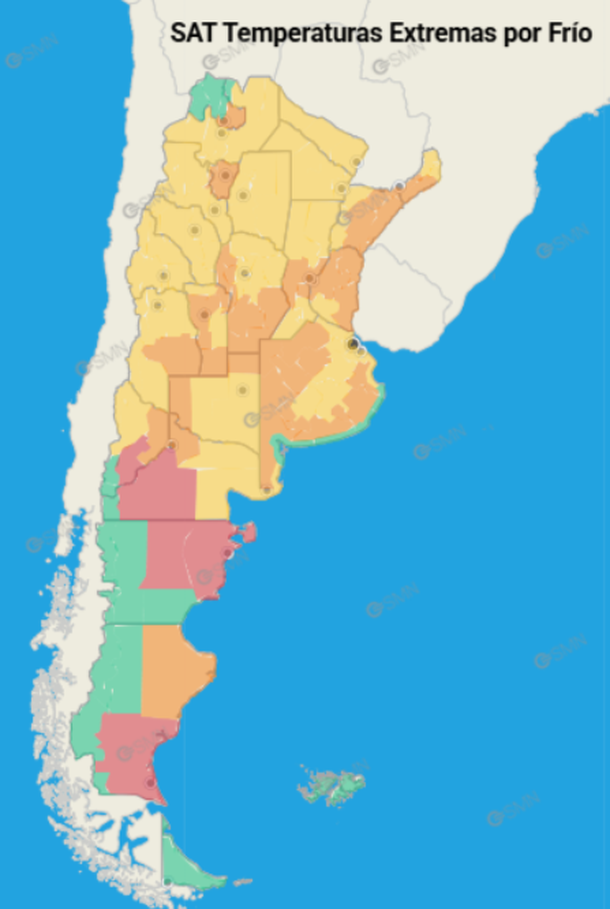 La única provincia del país que no está bajo alerta por temperaturas extremas -frío- de parte del organismo oficial en la jornada de este miércoles es Tierra del Fuego, el resto están con advertencias.
