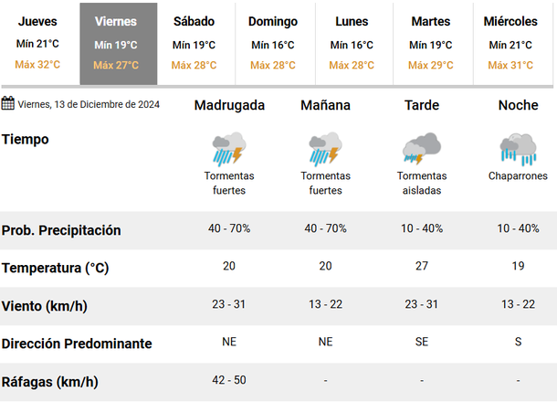 El cierre de la semana estará cargado de tormentas desde la madrugada. De hecho, el SMN anticipa que las precipitaciones durante las primeras horas de este viernes 13 de diciembre serán muy fuertes, también con ráfagas de hasta 50 kilómetros por hora. A lo largo del día, el viento irá rotando y cerrará la jornada con viento proveniente desde el Sur, lo que marca un descenso en las temperaturas.