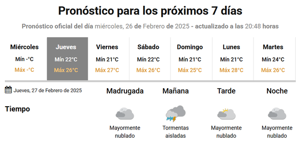 Para la jornada del viernes, el último día de febrero, se esperan lluvias durante toda la tarde y la noche, algo que se mantendrá el sábado primero de marzo por la madrugada.