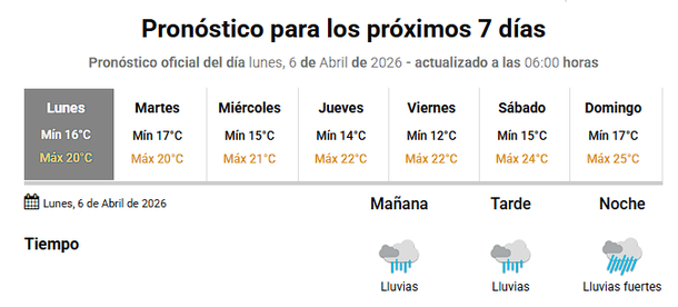 A partir del miércoles, el tiempo comenzará a estabilizarse de manera gradual. Si bien el cielo seguirá mayormente nublado, las chances de lluvia serán bajas y las temperaturas se mantendrán en valores similares, con mínimas cercanas a los 15° y máximas de 21°.