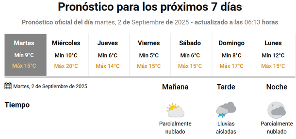 El viernes sería la jornada más fría de la semana, con cielo entre algo y parcialmente nublado, una mínima de 3 grados y una máxima que treparía hasta 14.