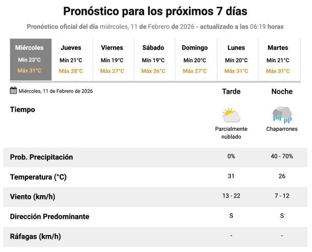 La jornada más templada sería el sábado, para cuando el SMN prevé todavía cielo parcialmente nublado, con una temperatura mínima de 19 grados y una máxima que subiría a 26.