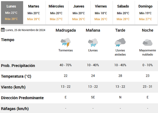 "El área será afectada por tormentas de variada intensidad, algunas localmente fuertes. Las mismas podrán estar acompañadas por abundante caída de agua en cortos periodos, frecuente actividad eléctrica, caída de granizo y ráfagas intensas. Se prevén valores de precipitación acumulada entre 30 y 50 mm, pudiendo ser superados en forma puntual", anunció el SMN.