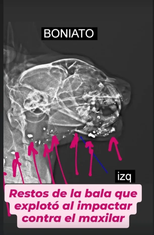 El sábado 26 de julio, luego de varios días de andar deambulando, Boniato —un felino de pelaje anaranjado y apenas dos años— reapareció en el hogar de su humana, Fernanda, pero con una grave lesión en la cara. La mujer, alarmada, lo llevó de urgencia a una clínica veterinaria, donde una radiografía confirmó lo impensado: el animal tenía restos de un proyectil alojados en su mandíbula, producto de un disparo en la zona del rostro.