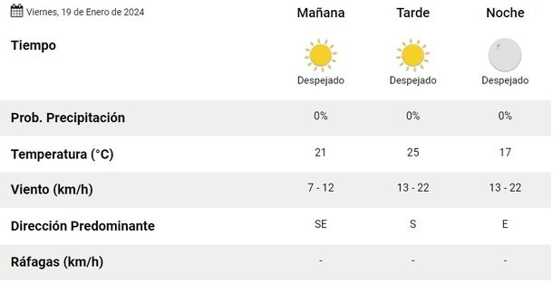 Para el sábado 20 de enero se espera una mínima de 15°C y una máxima de 25°C, con cielo despejado y algunas nubes hacia la noche.