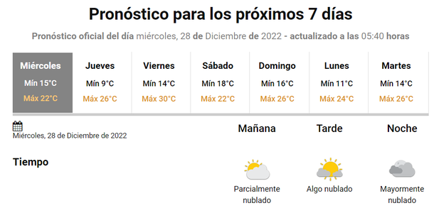 Para este miércoles 28 de diciembre de 2022 se espera jornada mayormente soleada, con vientos suaves, lo que permite ir a la playa sin problema, más allá de que la máxima solo llegará a los 22 grados.