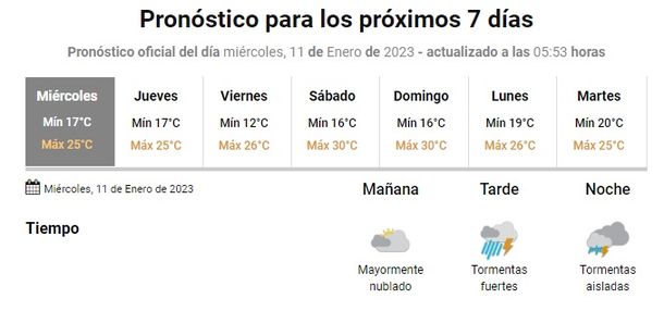 El Servicio Meteorológico Nacional (SMN) prevé para este miércoles 11 de enero tormentas de intensidad variada hacia la tarde noche, vientos moderados del este y una temperatura que irá de los 17 a los 25 grados en Mar del Plata.