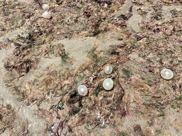 Estos huevos tienen, a simple vista, aspecto de globos amarillos y las algas se asemejan a plantas marinas que llegaron empujadas por la fuerza del mar. Desde la municipalidad aseguraron que se trata de "animales simples" que usualmente aparecen sobre la arena luego de un proceso natural.