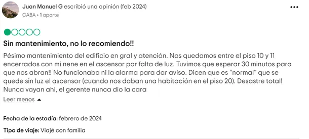 "Pésimo mantenimiento del edificio en general y atención. Nos quedamos entre el piso 10 y 11 encerrados con mi nene en el ascensor por falta de luz. Tuvimos que esperar 30 minutos para que nos abran!! No funcionaba ni la alarma para dar aviso. Dicen que es "normal" que se quede sin luz el ascensor (cuando nos daban una habitación en el piso 20). Desastre total! Nunca vayan ahí el gerente nunca dio la cara", escribieron.