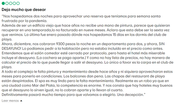 "Estoy instalado y mañana me mudo al Hermitage las almohadas parecen ladrillos el desayuno dicen que te avisaron que te lo cobraban no es así cuando reservamos dice 2 restaurante y funciona uno solo con 2, tablas de picada y 4 platos la gente fuma en los ascensores y no pasa nada está deteriorado el baño viejisimo un peligro la bañera.