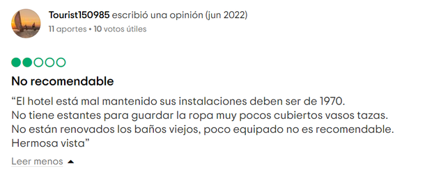 "Pague por un cuatro estrellas y no llega a dos. Mobiliario viejo, ropa de cama percudida. Los servicios del spa desatendidos, la persona responsable hizo ingresar gente no autorizada que alteró la tranquilidad del spa y hasta fumó en ese espacio cerrado.