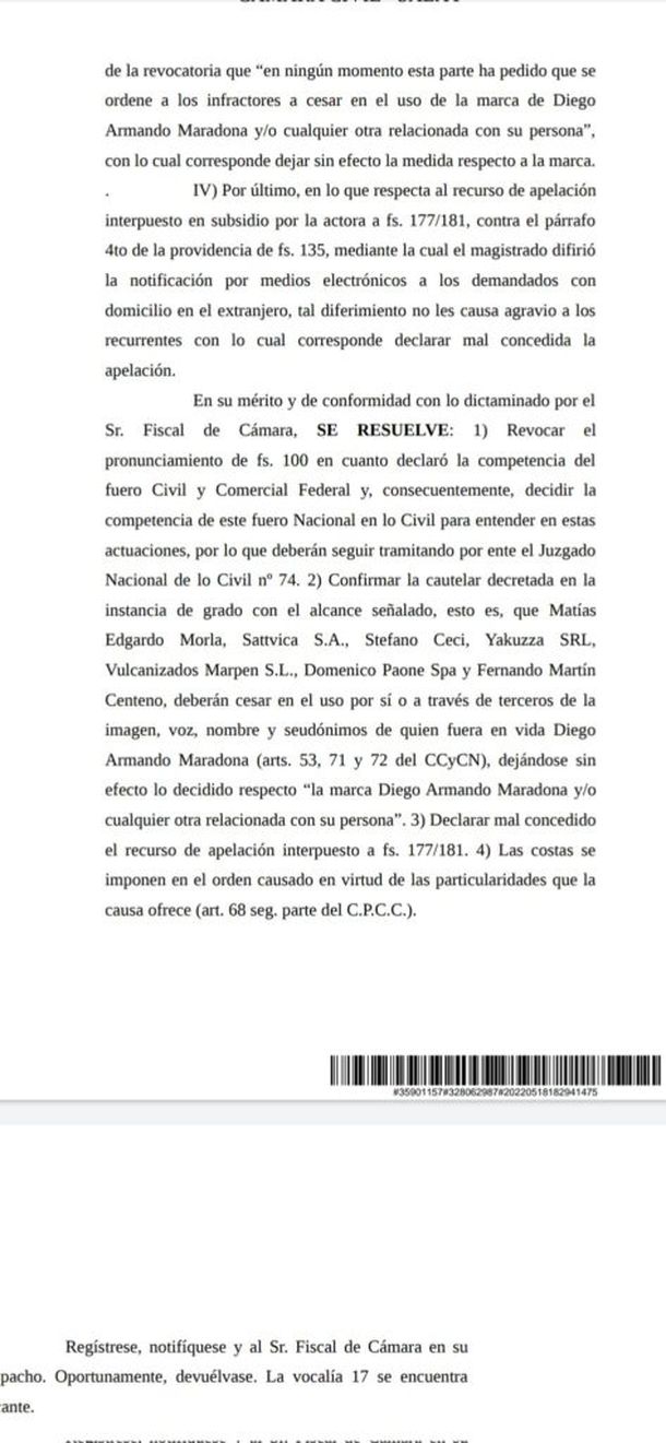 "Matías Edgardo Morla, Sattvica S.A., Stefano Ceci, Yakuzza SRL, Vulcanizados Marpen S.L., Domenico Paone Spa y Fernando Martín Centeno, deberán cesar en el uso por sí o a través de terceros de la imagen, voz, nombre y seudónimos de quien fuera en vida Diego Armando Maradona (arts. 53, 71 y 72 del CCyCN), dejándose sin efecto lo decidido respecto a 'la marca Diego Armando Maradona' y/o cualquier otra relacionada con su persona", indica el documento.