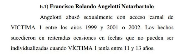 Según fragmentos de la causa a las que accedió minutouno.com, Angelotti “abusó sexualmente con acceso carnal de Víctima 1 entre los años 1999, 2001 y 2002”. El escrito detalla que “los hechos sucedieron en reiteradas ocasiones en fechas que no pueden ser individualizadas cuando Víctima 1 tenía entre 11 y 13 años”.