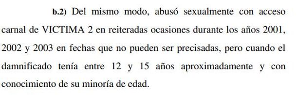 Según estos fragmentos, “del mismo modo, abusó sexualmente con acceso carnal de Víctima 2 en reiteradas ocasiones durante los años 2001, 2002 y 2003 en fechas que no pueden ser precisadas, pero cuando el damnificado tenía entre 12 y 15 años aproximadamente y con conocimiento de su minoría de edad”.