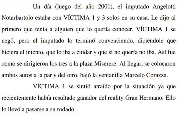 Entonces, se menciona cómo las Víctimas 1 y 3 conocieron a Corazza: “Un día (luego del año 2001), el imputado Angelotti Notarbartolo estaba con Víctima 1 y 3 solos en su casa. Le dijo al primero que tenía a alguien que lo quería conocer. Víctima 1 se negó, pero el imputado lo terminó convenciendo, diciéndole que hiciera el intento, que lo iba a cuidar y que si no quería no iba”.