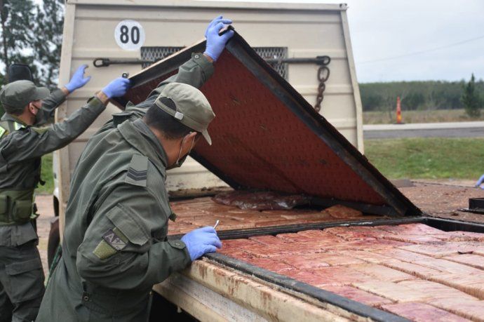Cuando comenzaron el registro notaron que la zona marcada por "Roque" tenia tornillos nuevos respectos del resto de los materiales. Removieron el piso y hallaron un doble fondo donde trasladaban panes de marihuana.