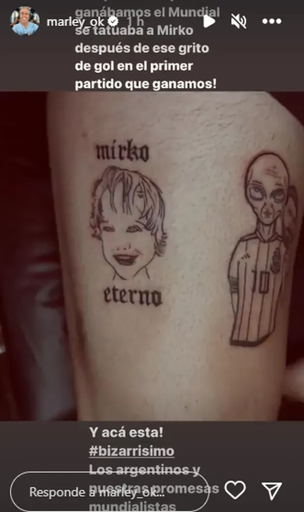 "Uno prometió que si ganábamos el mundial se tatuaba a Mirko después de ese grito de gol en el primer partido que ganamos", explicó en su historia Marley. "¡Y acá está! Bizarrísimo. Los argentinos y nuestras promesas mundialistas", agregó.