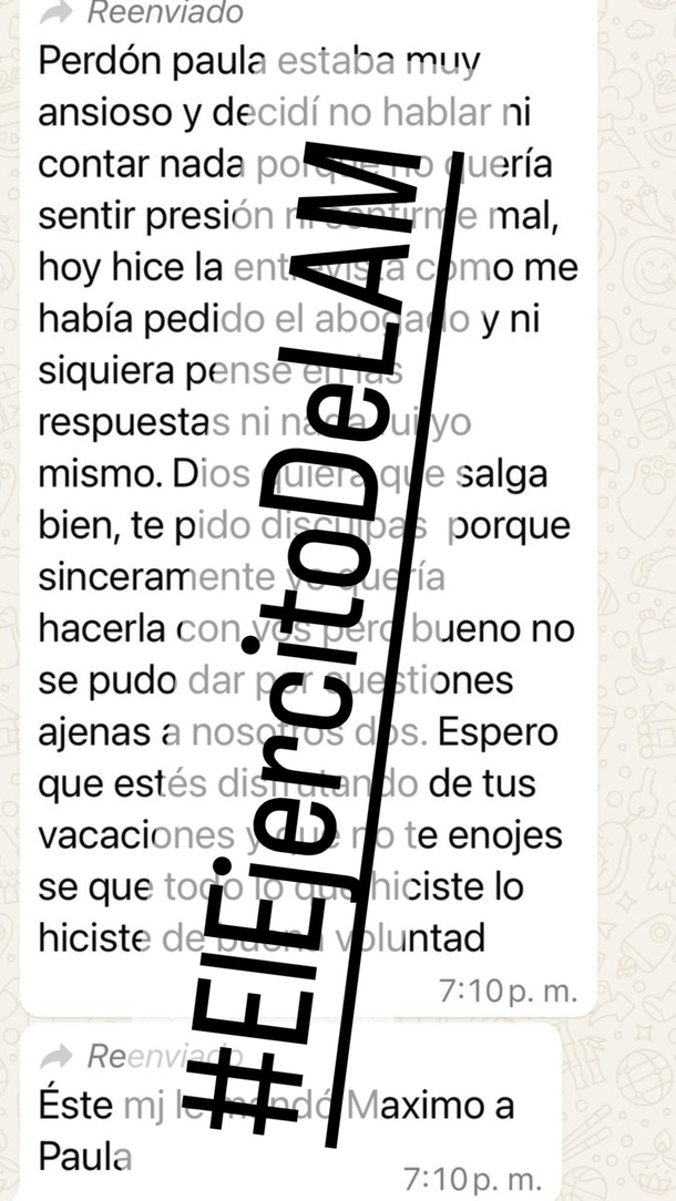 "Estaba muy ansioso y decidí no hablar ni contar nada porque no quería sentir presión ni sentirme mal. Hoy hice la entrevista como me había pedido el abogado y ni siquiera pensé en las respuestas ni fui yo mismo", dice el mensaje.