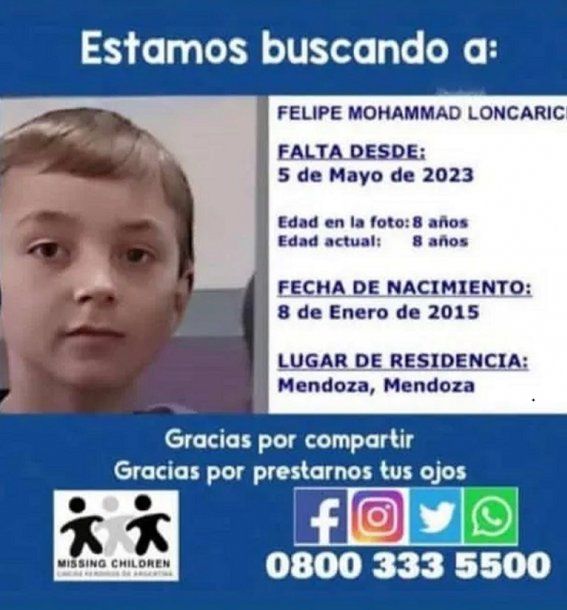 Felipe Mohammad Loncarich tiene 8 años y desapareció hace más de una semana en Mendoza. Es intensamente buscado por familiares y autoridades policiales y judiciales. Fue visto por última vez el viernes 5 de mayo en su casa de Guaymallén, de acuerdo con la denuncia que se realizó en un Juzgado de Familia.
