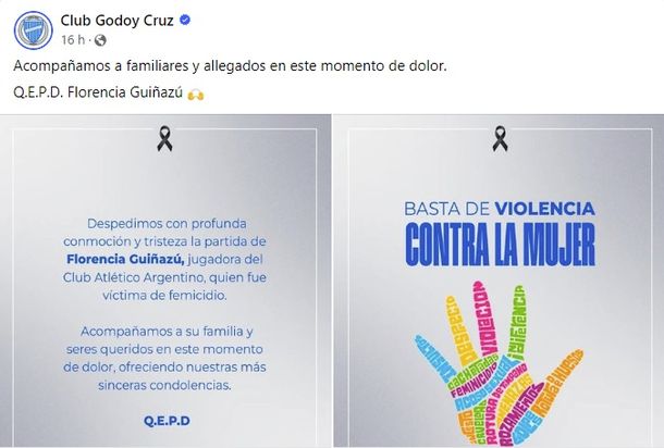 En la misma línea se expresaron desde el club Godoy Cruz de Mendoza: “Despedimos, con profunda conmoción y tristeza, a Florencia Guiñazú, quien fue víctima de femicidio. Acompañamos a su familia y seres queridos en este momento de dolor, ofreciendo nuestras más sinceras condolencias. Q.E.P.D.”.