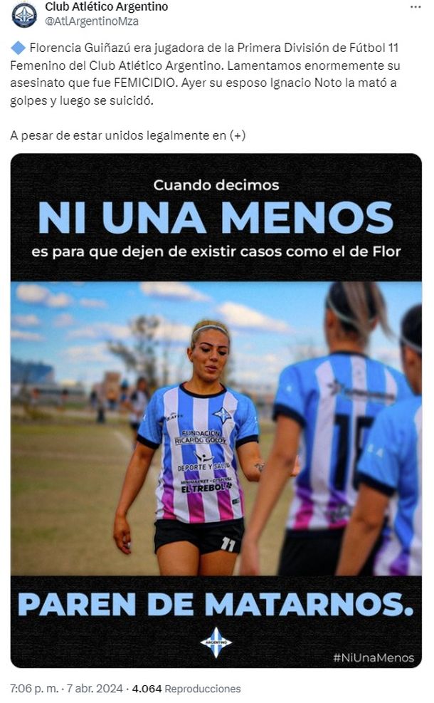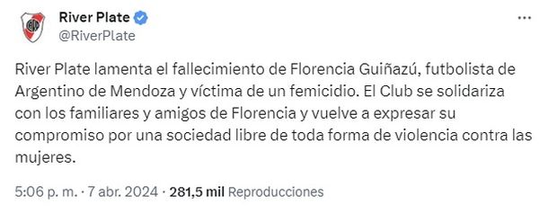 “River Plate lamenta el fallecimiento de Florencia Guiñazú, futbolista de Argentino de Mendoza y víctima de un femicidio. El club se solidariza con los familiares y amigos de Florencia y vuelve a expresar su compromiso por una sociedad libre de toda forma de violencia contra las mujeres”, escribió el club Millonario en su cuenta de X.