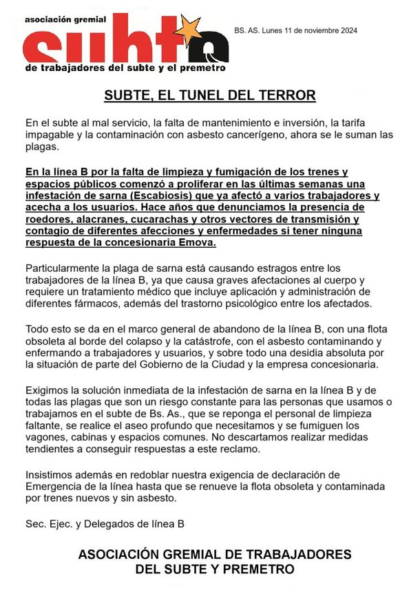 El comunicado de los metrodelegados con la denuncia de sarna en la Línea B del subte