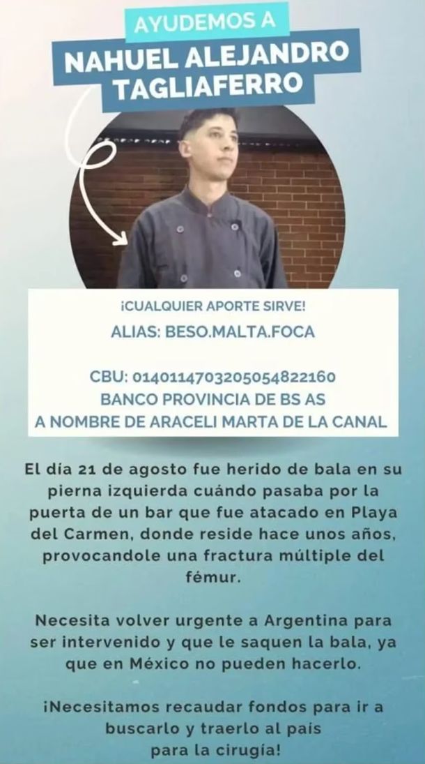 Un argentino, Nahuel Alejandro Tagliaferro, fue herido en un presunto tiroteo narco en México y su familia solicita ayuda para trasladarlo a la Argentina y realizar una operación riesgosa.