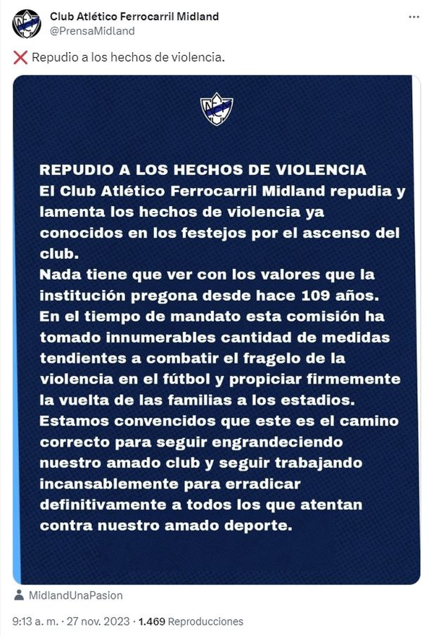 "El Club Atlético Ferrocarril Midland repudia y lamenta los hechos de violencia ya conocidos en los festejos por el ascenso. Nada tienen que ver con los valores que la institución pregona desde hace 109 años", introduce un comunicado subido en los canales oficiales de la institución de la localidad bonaerense de Libertad.