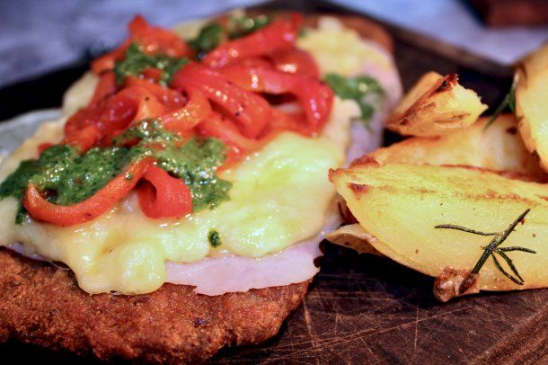 Maiky ofrece una milanesa de bola de lomo con rebozado ahumado con astillas de nogal (el rebosado se hace con pan casero molido). Está acompañada con provoleta, jamón, marrones asados y pesto de albahaca y nuez.