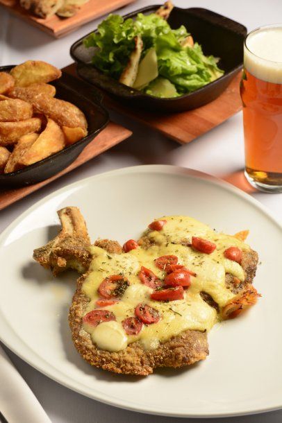 La cervecería Brew Republic, en Recoleta, ofrece la Mila Republic con queso pulpeta y tomates cherries confitados con papas rusticas y ensalada coleslaw.
