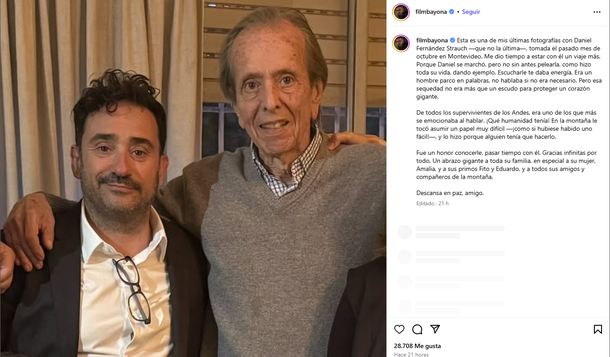 Juan Antonio Bayona, director de la película "La sociedad de la nieve", también publicó un conmovedor mensaje en su cuenta de Instagram, donde compartió una de las últimas fotos que se tomó con Strauch en octubre, en Montevideo. “Me dio tiempo a estar con él un viaje más”, expresó sobre aquel encuentro.