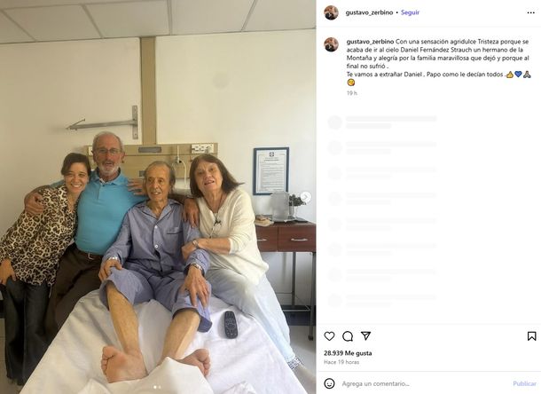 “Con una sensación agridulce. Tristeza porque se acaba de ir al cielo Daniel Fernández Strauch un hermano de la Montaña y alegría por la familia maravillosa que dejó y porque al final no sufrió. Te vamos a extrañar Daniel, Papo como le decían todos”, escribió Zerbino en sus redes sociales.