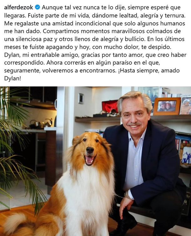 “Fuiste parte de mi vida, dándome lealtad, alegría y ternura. Me regalaste una amistad incondicional que solo algunos humanos me han dado”, escribió Fernández. “En los últimos meses te fuiste apagando y hoy, con mucho dolor, te despido”, completó.