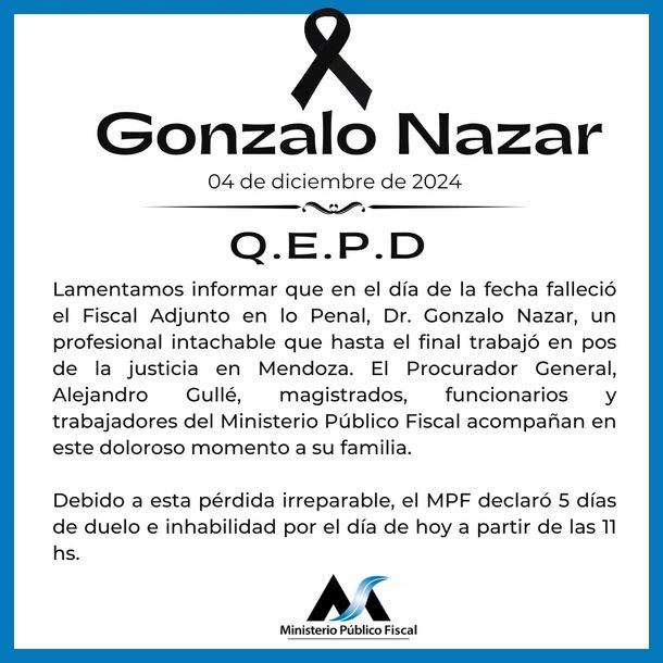 Nazar permanecía internado desde el viernes como consecuencia de complicaciones en su salud a raíz de una grave enfermedad que atravesaba, según informaron medios mendocinos. A raíz de su fallecimiento, el MPF provincial decretó cinco días de duelo. A través de un comunicado, lo describieron como “un profesional intachable que hasta el final trabajó en pos de la justicia de Mendoza”.