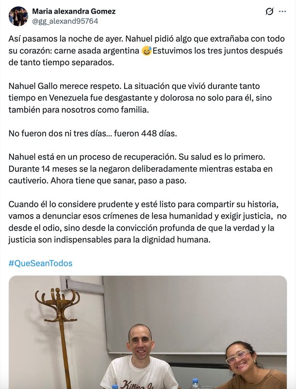 Más allá de la emotividad del reencuentro, el mensaje de su esposa fue contundente respecto al estado de salud del gendarme y las condiciones de su cautiverio. "Nahuel está en un proceso de recuperación. Su salud es lo primero. Durante 14 meses se la negaron deliberadamente", denunció, subrayando el desgaste y el dolor vivido por la familia durante este extenso periodo.